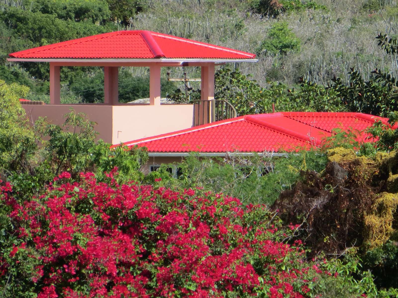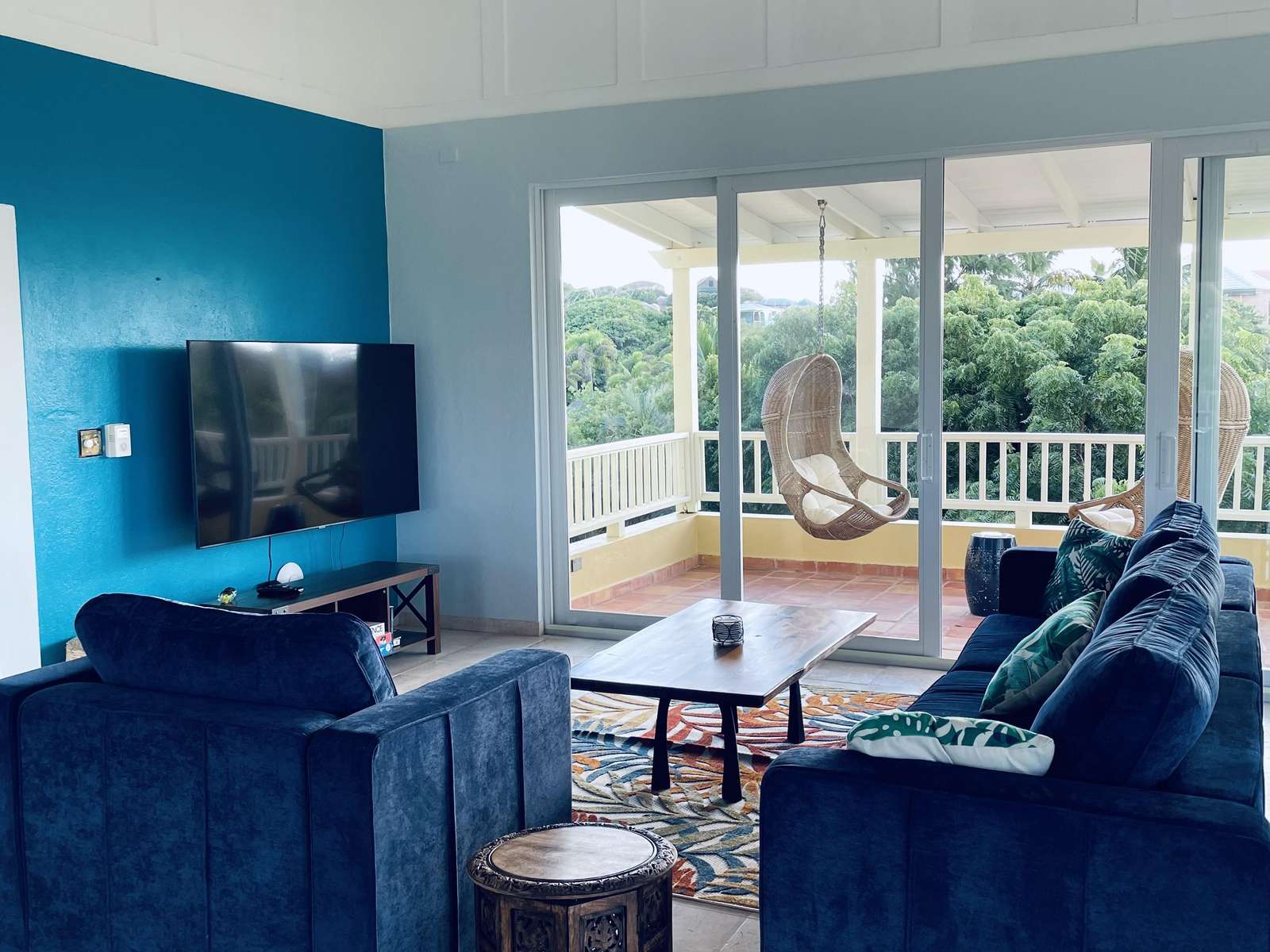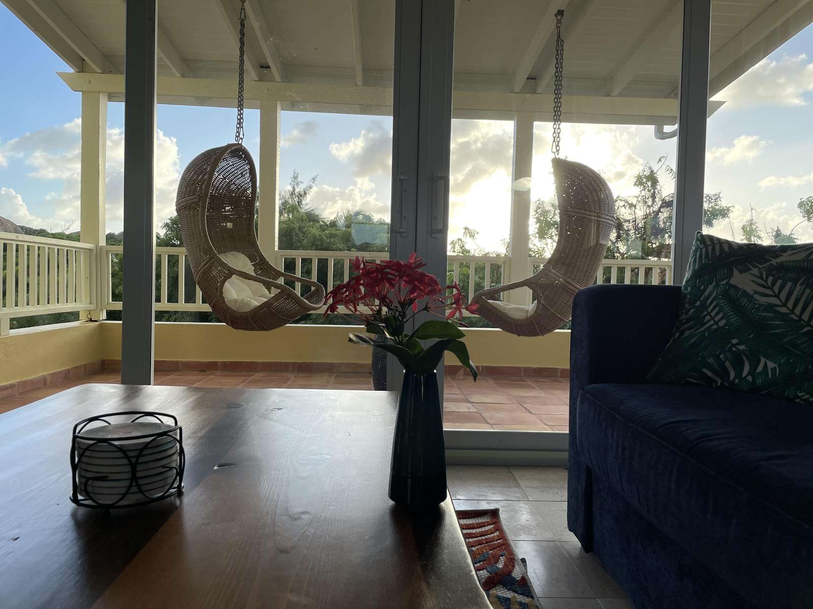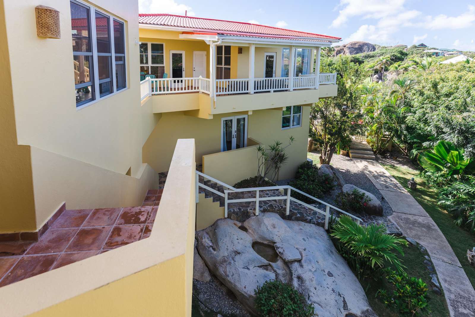 - Guest Room 1 (Upper Level): Includes a queen bed, outdoor shower, and a private veranda.