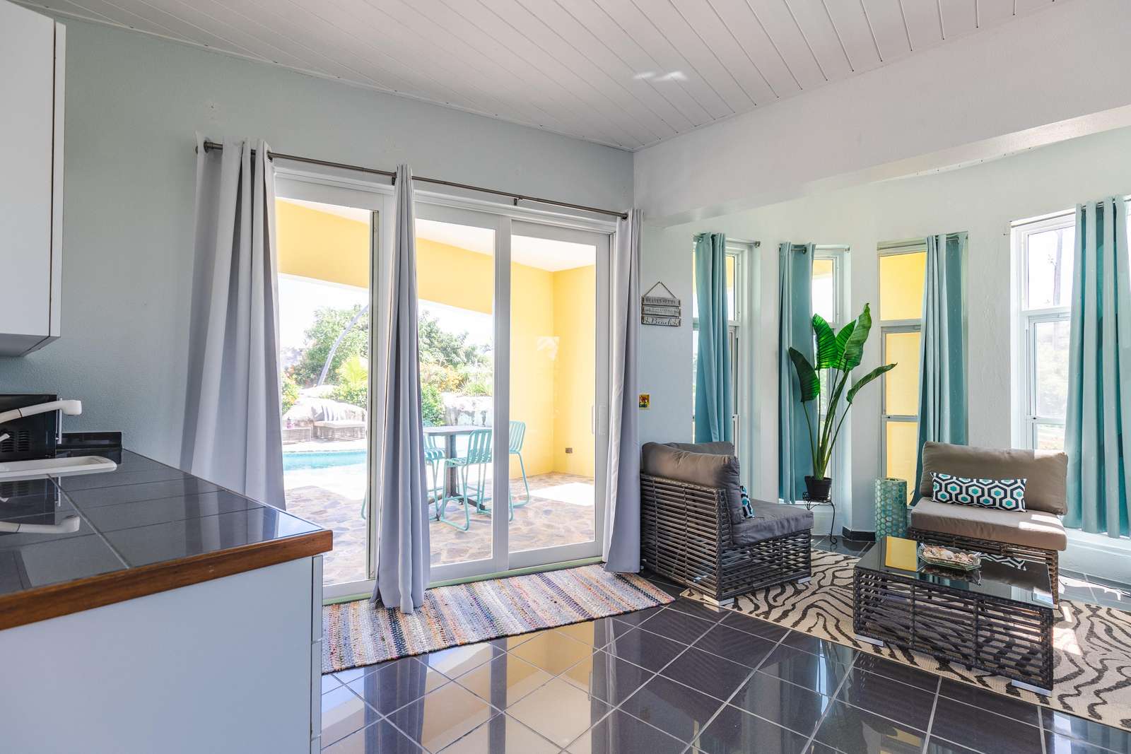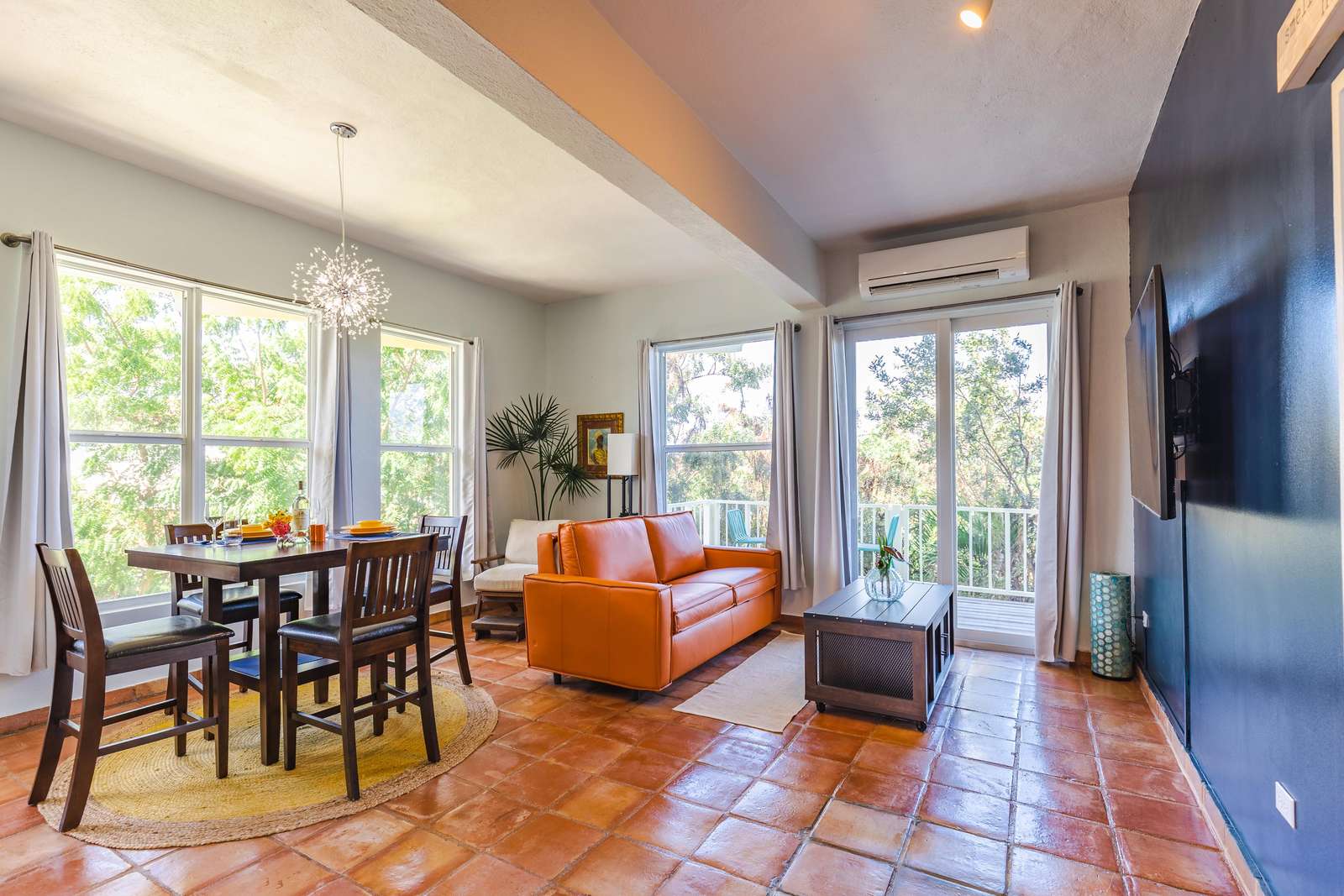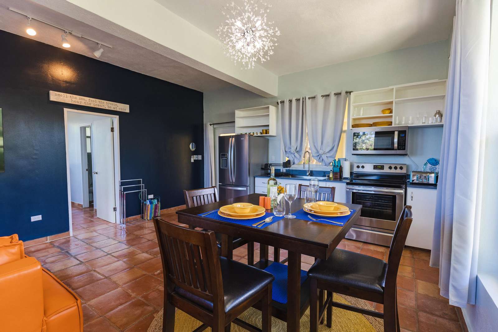 - A fully equipped kitchen, living area, and dining area