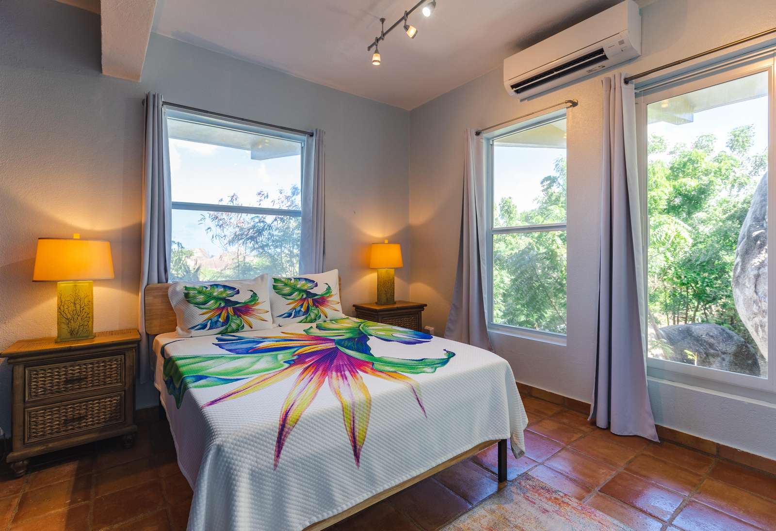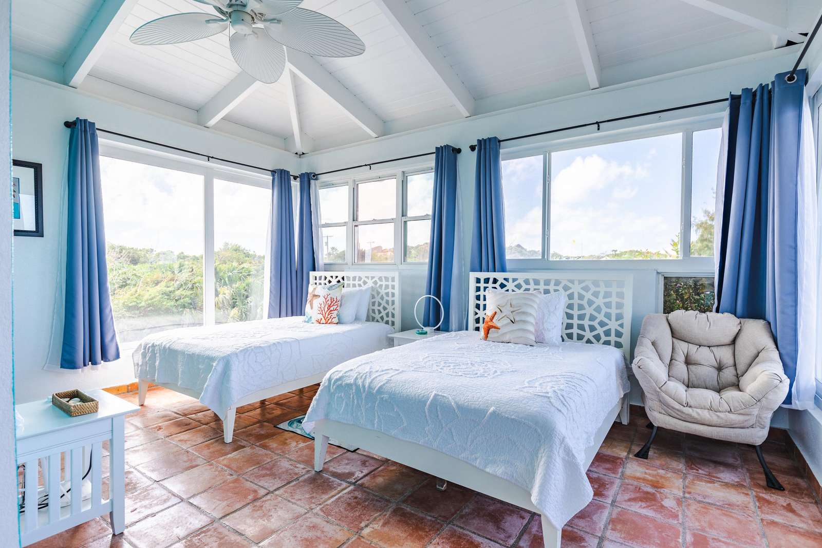 - Guest Room 2 (Upper Level): Features two double beds and spectacular island views.
