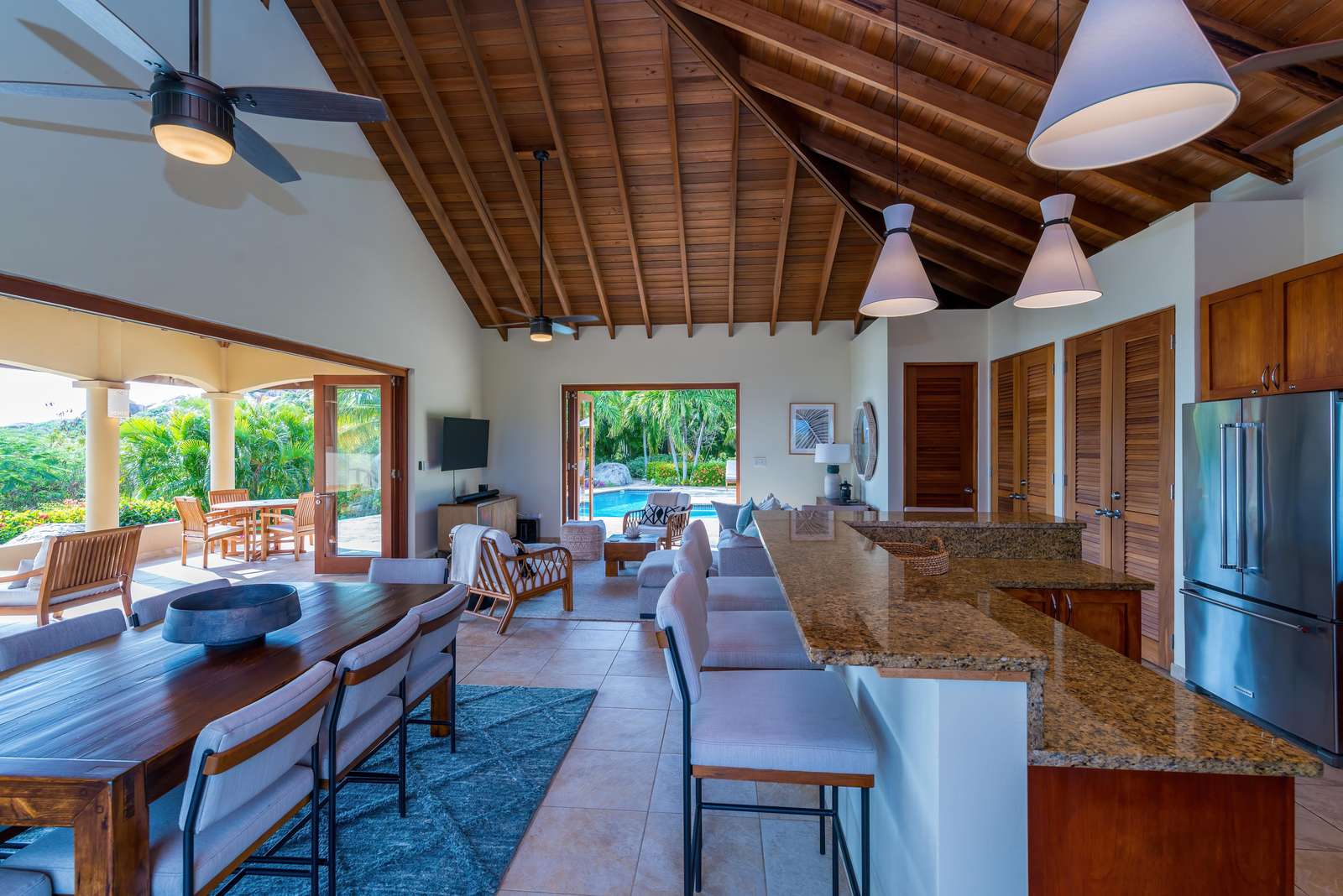 Calypso Villa boasts a fully equipped chef's kitchen with granite countertops and stainless steel appliances. Additionally, there are three dining options, including an indoor table for 8, kitchen island seating, and a smaller teak table on the covered porch for 4.
