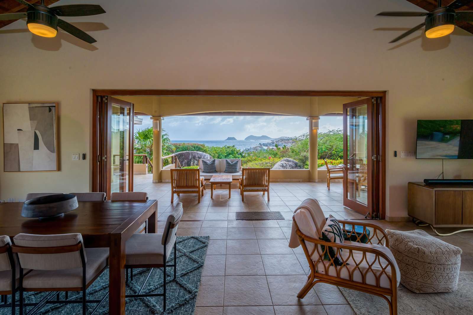 The living space of Calypso Villa is divided into two pavilions. The first pavilion encompasses the villa's great room, featuring an expansive area with soaring cathedral ceilings housing the kitchen, living room, and dining room. The great room is adorned with collapsible glass doors, offering an immersive Caribbean indoor-outdoor living experience.