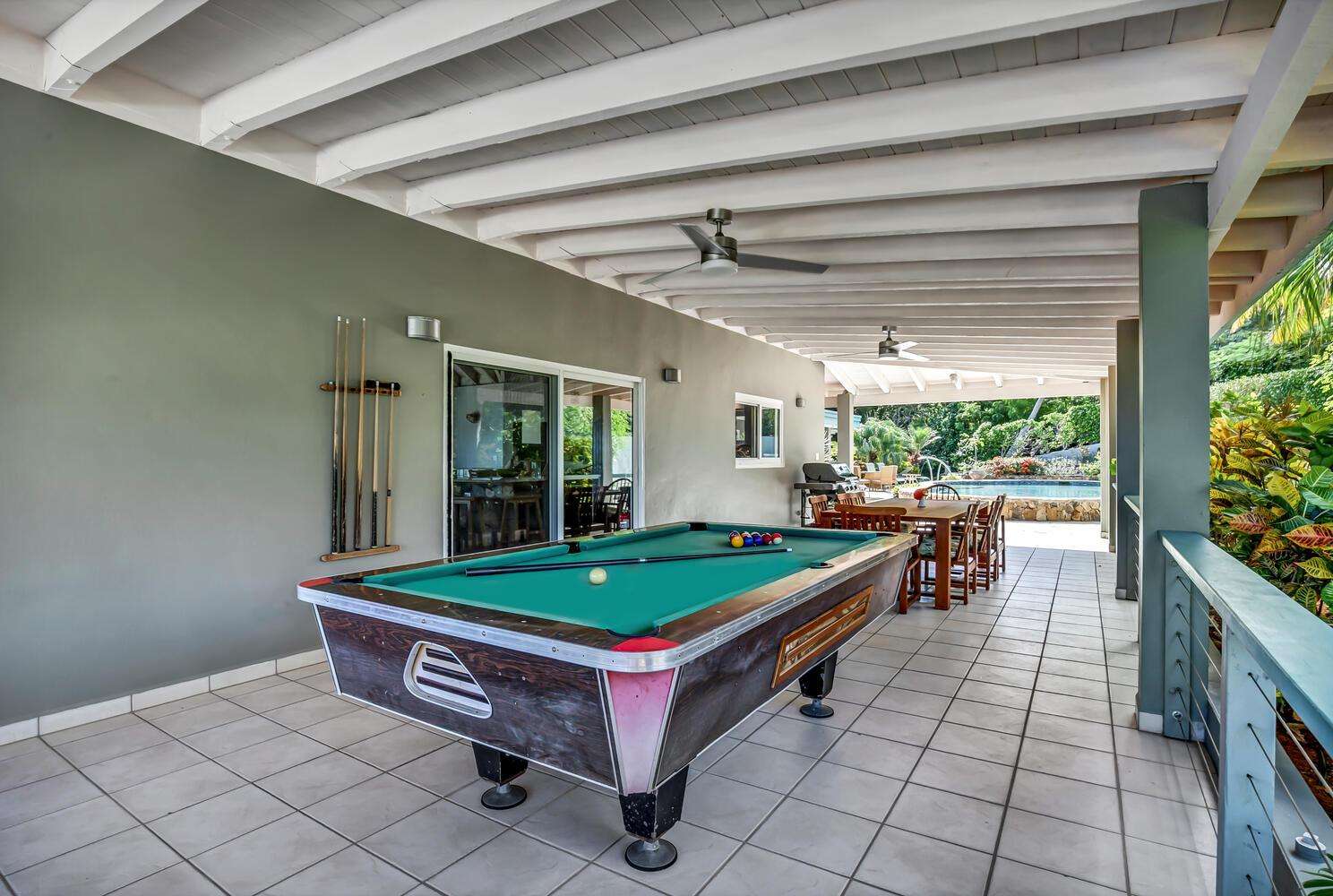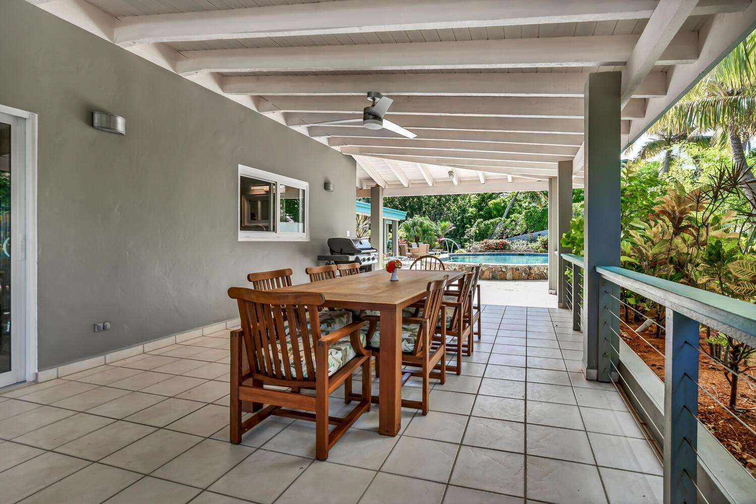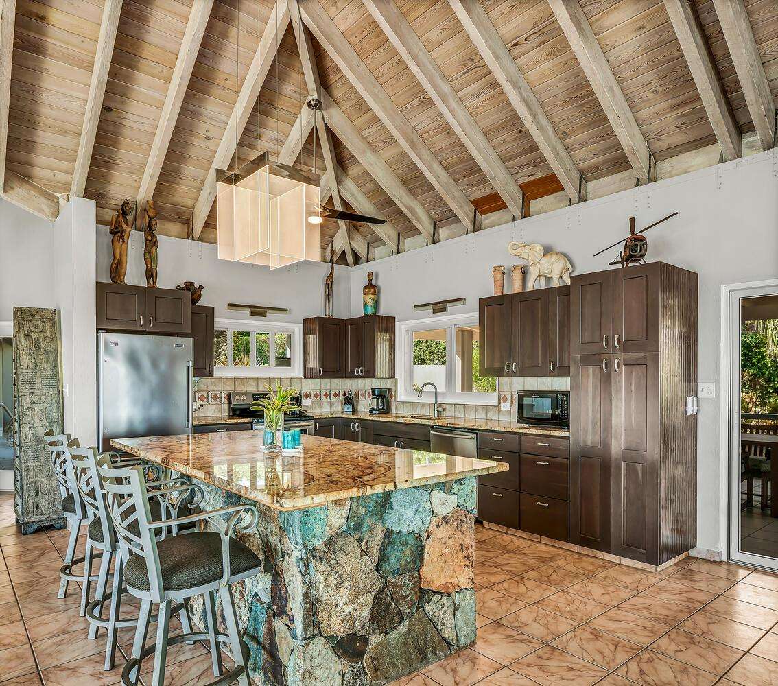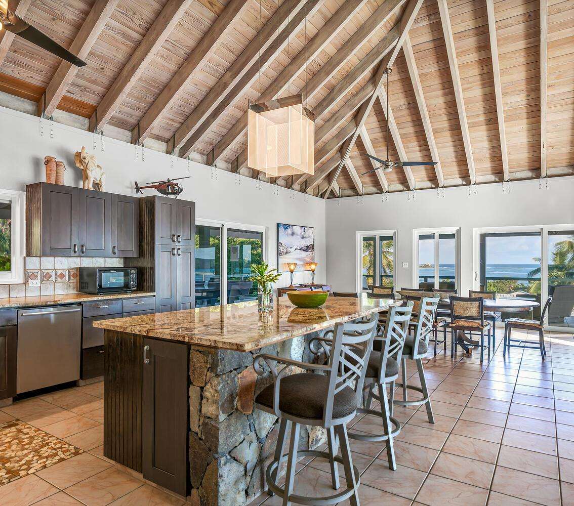 Alfresco Living: Step outside to the covered dining area, alfresco bar, and pool area. The alfresco bar is fully equipped with a refrigerator/freezer, sink, glasses, and beach coolers—ideal for entertaining by the pool or enjoying a cocktail while taking in the Caribbean sea views.