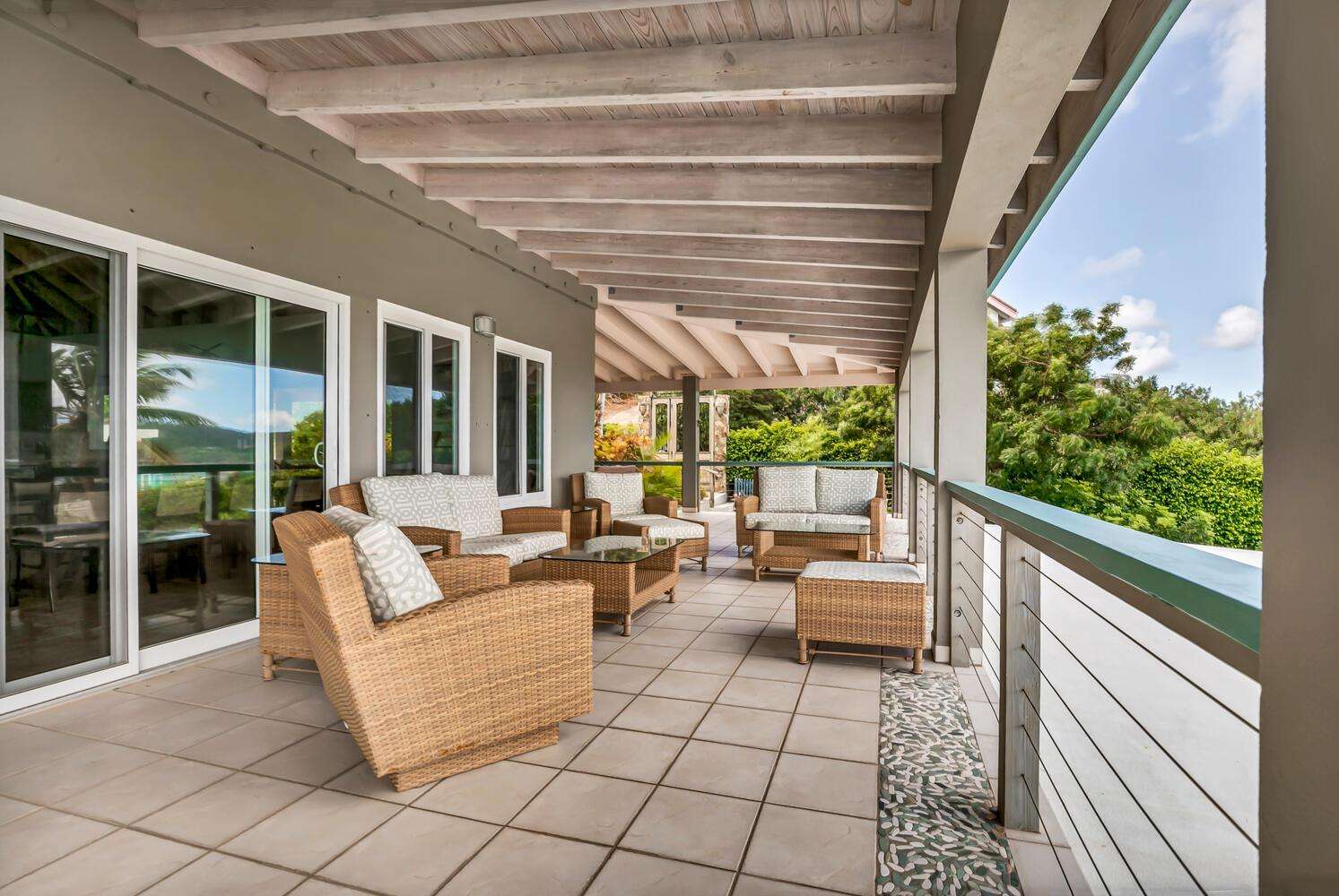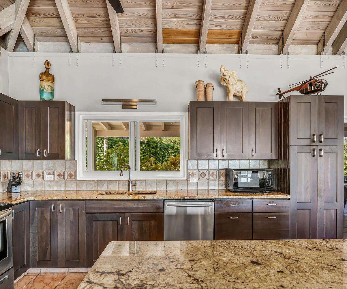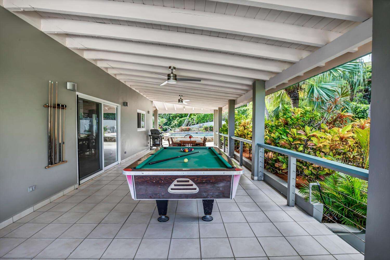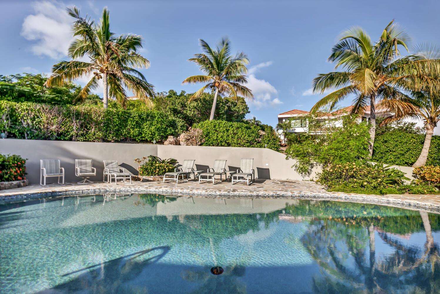 Alfresco Living: Step outside to the covered dining area, alfresco bar, and pool area. The alfresco bar is fully equipped with a refrigerator/freezer, sink, glasses, and beach coolers—ideal for entertaining by the pool or enjoying a cocktail while taking in the Caribbean sea views.