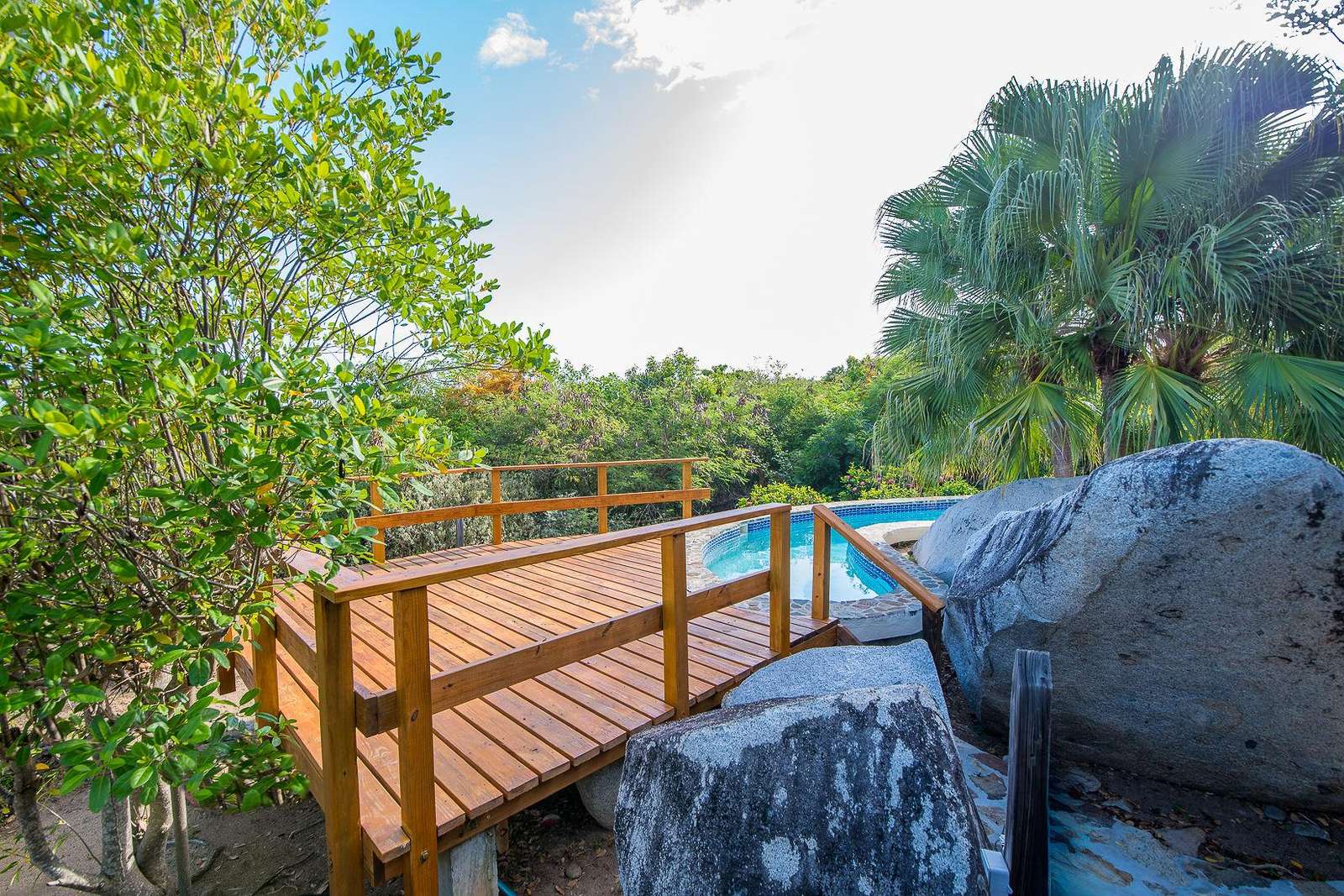The villa’s lush grounds are a haven of tropical flora and Virgin Gorda’s signature boulders.