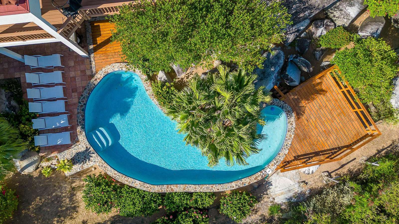 Private freeform pool on the lower patio, surrounded by sun loungers and shaded dining spaces.